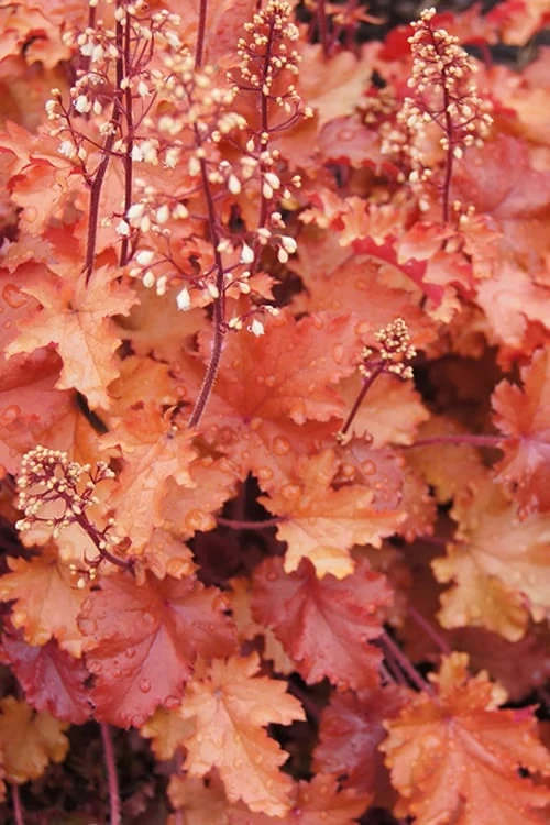A visual wonder, the Peach Crisp Heuchera features extremely ruffled leaves in shades of peachy orange to amber red in a tight mound to 6 inches tall and 14 inches wide. In late spring and early summer small white flowers dangle in loose clusters on 15 inch stems that rise above the mound. Peach Crisp is an ideal selection for small garden spaces and in container gardens. Evergreen in USDA Zones 8-10 and perennial in Zones 4a-7b.